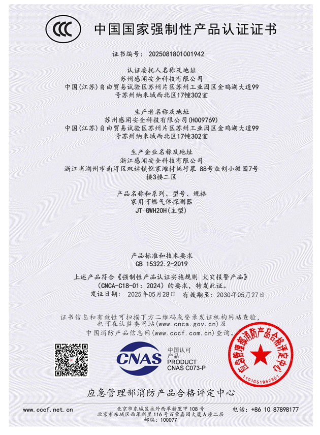 强制性消防产品认证是对产品安全性的重要认可,更是对消费者权益的坚决保护。感闻安全的CCC认证产品,能够实时监测环境中的可燃气体浓度,一旦发现泄漏,立即发出声光报警信号,提醒用户及时采取措施,有效避免事故的发生。