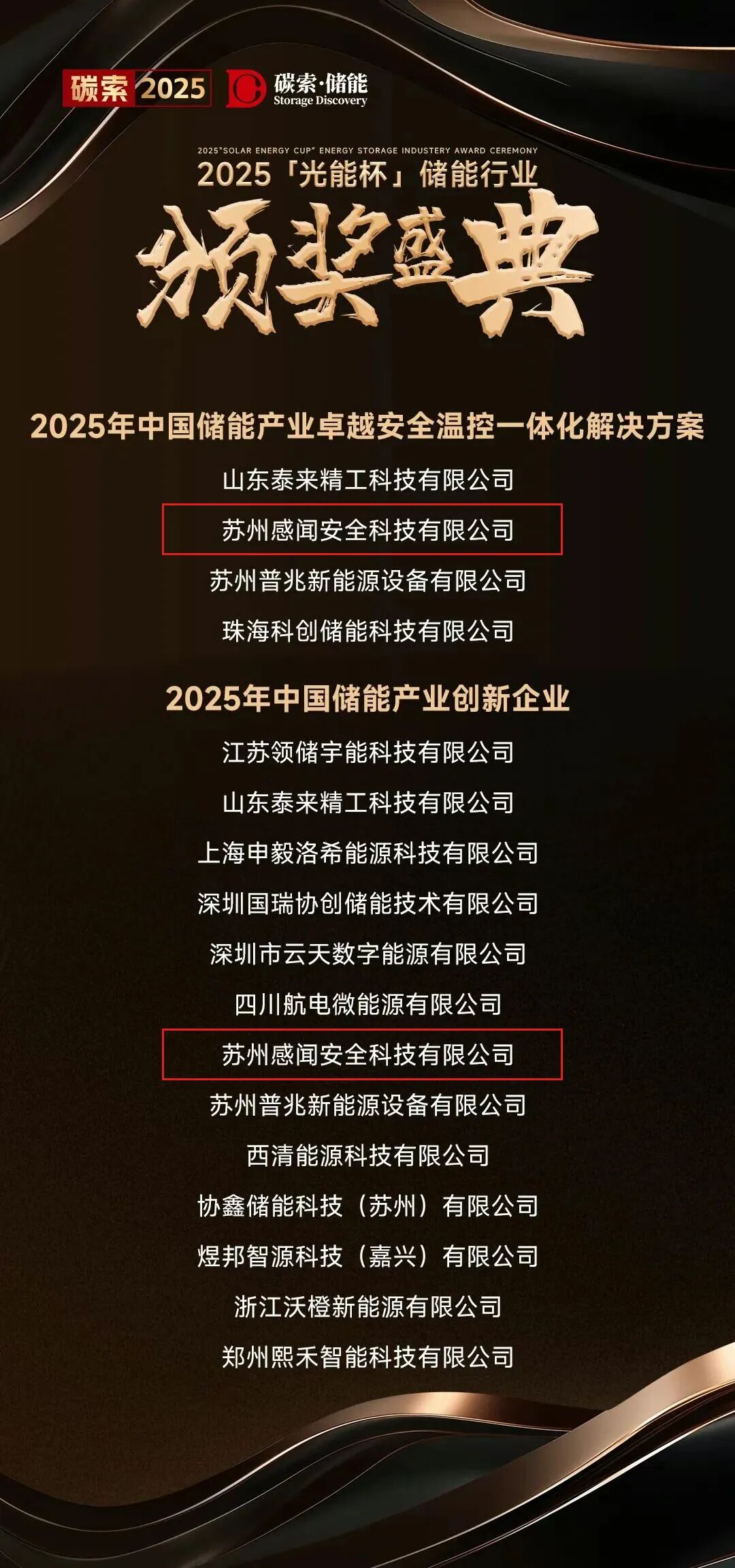 在本次评选中,感闻安全凭借在储能系统安全监测预警解决方案方面的综合实力与持续创新能力,荣获“2025年中国储能产业卓越安全温控一体化解决方案及2025年中国储能产业创新企业”两项奖项。此次荣誉代表了行业对感闻安全的认可与支持,未来感闻安全将秉承初心,不断提升储能消防预警技术与产品性能,在多种储能应用领域中不断推进相关产品与技术的深入应用!光能杯开始于2012年,是光伏储能行业深受瞩目的行业评选活动;作为光伏储能行业的年度盛宴,“光能杯”自2012年由索比光伏网发起以来,每一届评选都吸引了数百家光伏储能企业的积极参与,成为了行业内公认的“年终奥斯卡”。每一届评选都涌现出了一批批优秀的光伏储能企业和创新项目,为行业的转型升级和可持续发展注入了强大的动力。