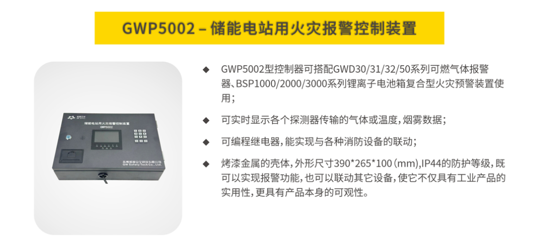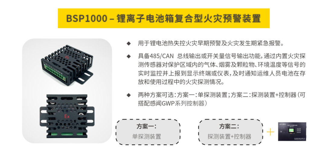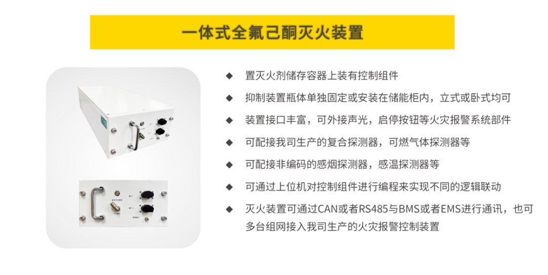 在火灾探测方面以探测报警系统为主:采用锂电池专用复合型探测器,在每个电池簇内部布置多个复合型探测器,同时检测电池箱的温度、一氧化碳(CO)、氢气(H2)、电解液泄漏气体(VOC)、烟雾等参数,并且通过综合算法进行判断,将信号传至主机,再传至各个平台。该探测报警系统能够极早期的超前探测到单个电池模块在初期火灾时,释放的信号,这样可以节约更多的时间处理信息以及将火灾抑制在较早时期。在火灾抑制(灭火)方面以电化学储能集装箱灭火系统为主:采用全氟己酮(多种灭火方式可选)前期无损精准定点多次喷射灭火,后期采用细水雾在电池舱内持续降温的方案。电化学储能舱灭火系统可以多次点喷全氟己酮从而抑制锂电池热失控和复燃,而喷射细水雾灭火可以对电池舱进行持续降温,避免火灾进 一步传播至相邻电池簇或相邻储能舱。该方案是由探测报警系统和电化学储能舱灭火系统组成:探测报警系统主要由锂离子电池箱复合型火灾预警装置、储能设备安全监测探测器、气体报警控制器、线缆等组成;电化学储能舱灭火系统由电化学储能舱火灾抑制装置(内含细水雾和全氟己酮)、喷头、电磁阀、管网等组成。