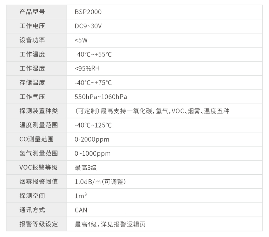 • 探测种类:CO,温度,烟雾,VOC或氢气(最高支持5种)